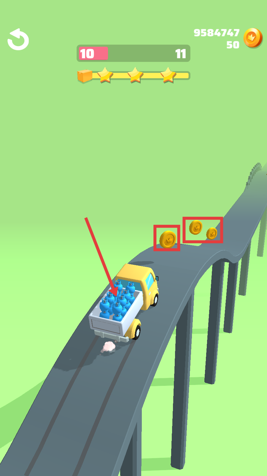 2、驾驶时保持稳定,避开道路颠簸,确保货物(蓝色煤气罐)不坠落,优先收集金币。