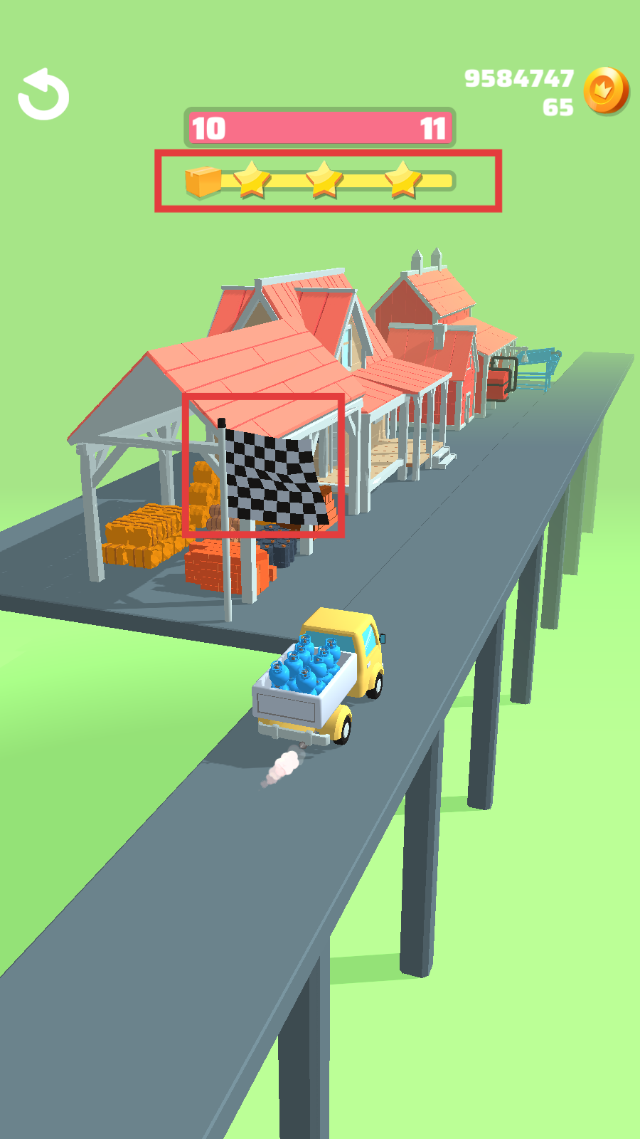 3、小心操纵汽车的速度,注意上方有星星的黄条,只要没有货物掉落,就不会有什么损耗,朝着终点黑白旗方向行驶。