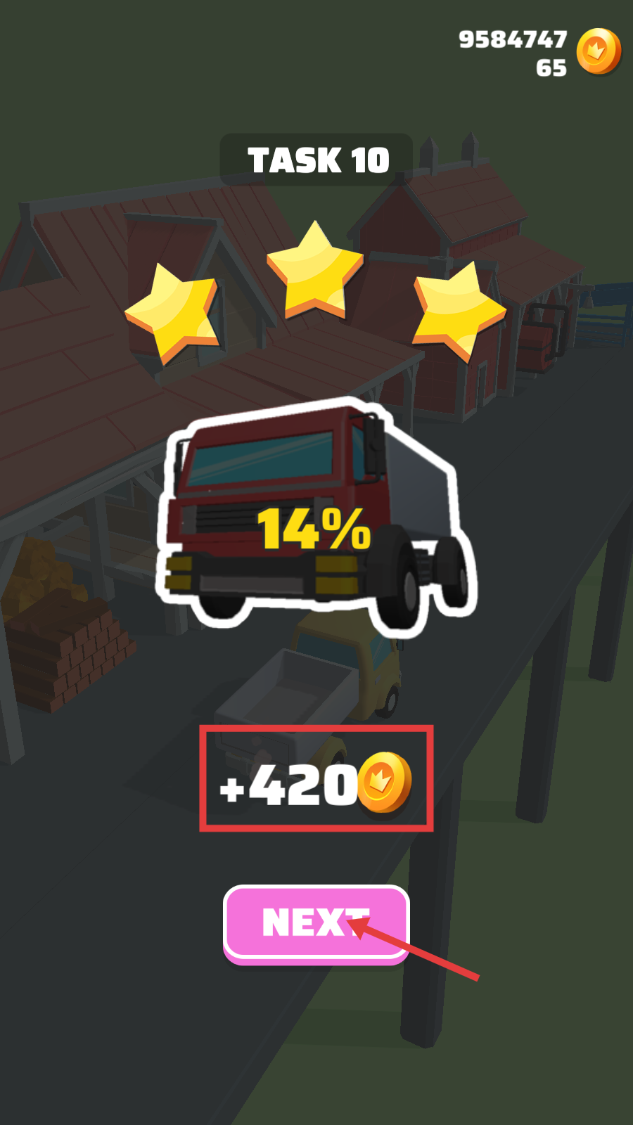 4、抵达终点后,领取420金币奖励,点击NEXT挑战下一关。