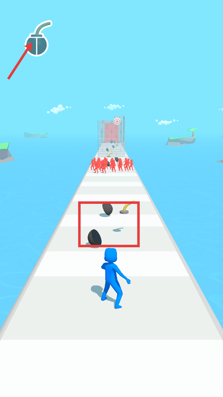 1、操控蓝色小人,在跑道收集【炸弹碎片】和【引线】组成炸弹。