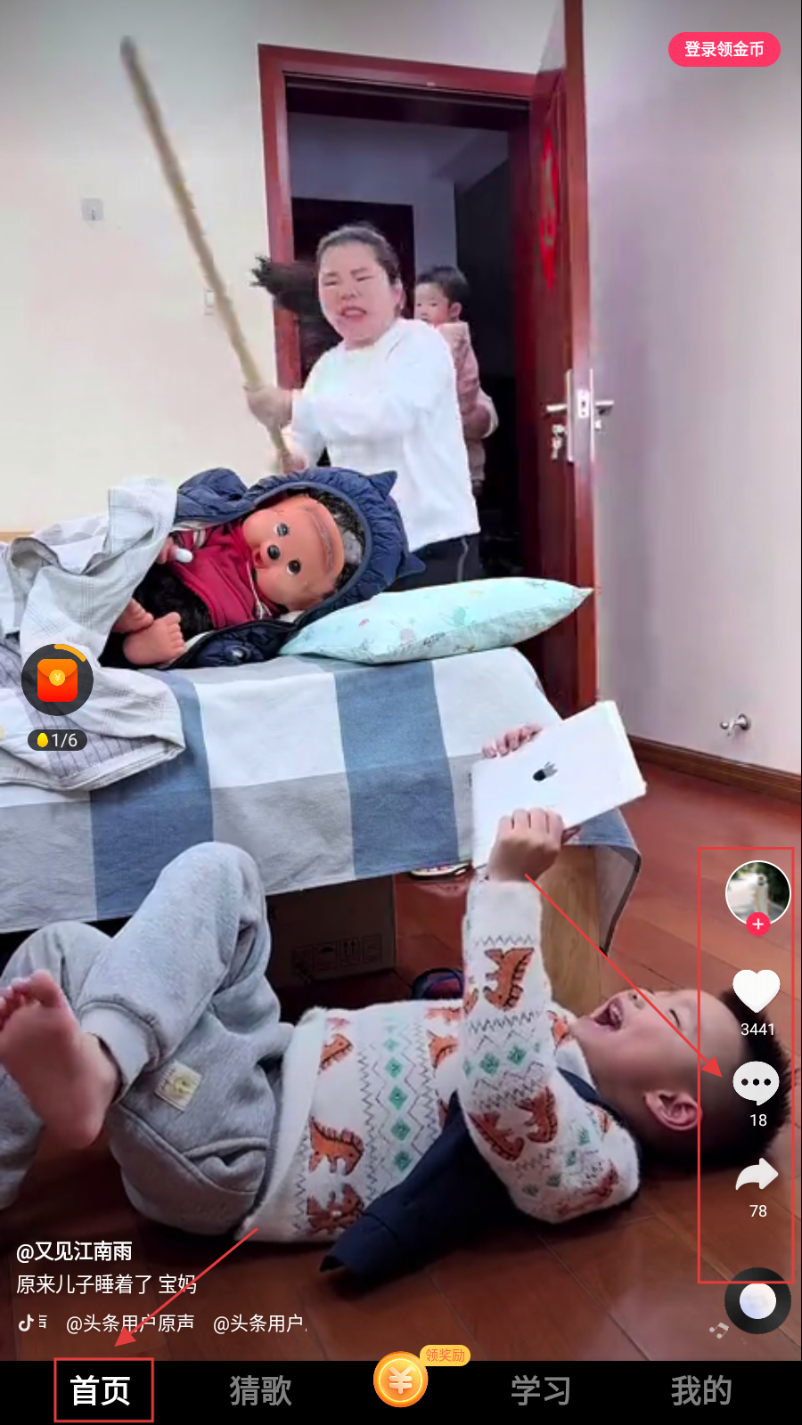 1、打开应用后,在【首页】浏览视频内容,遇到喜欢的视频可点击右侧评论按钮查看其他用户的评论。