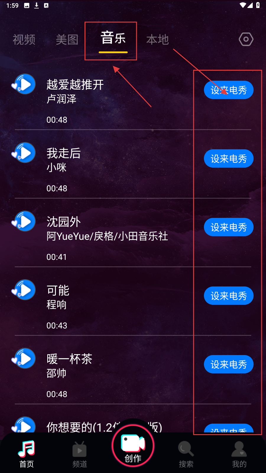 3、切换到音乐分类页面,可选择喜欢的音乐,点击【设来电秀】将该音乐设置为来电铃声。