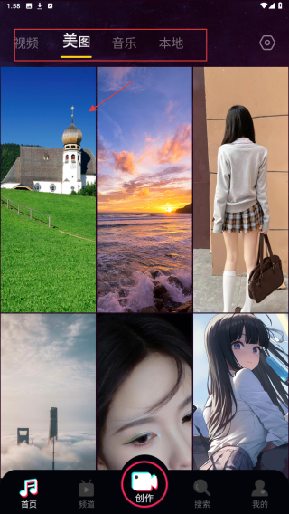 4、点击底部导航栏的【创作】按钮,可进入来电秀创作页面,选择素材库、语音来电、本地、音乐来电等方式创作个性化来电秀。
