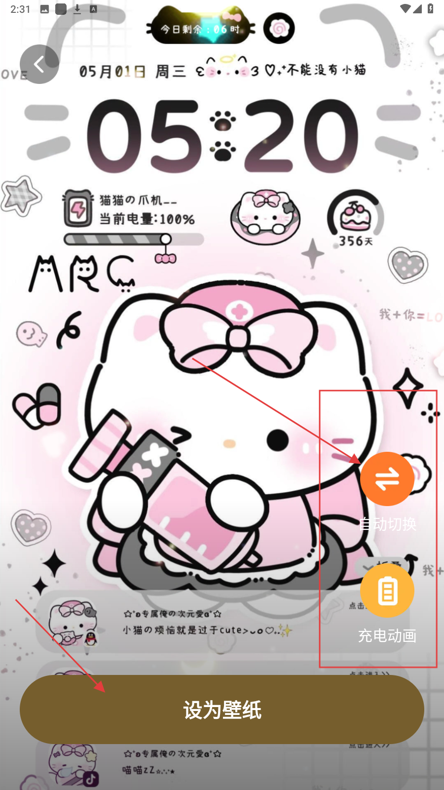 2、在壁纸详情页面,可点击【设为壁纸】按钮将该动态壁纸设置为手机壁纸,还可设置自动切换和充电动画效果。