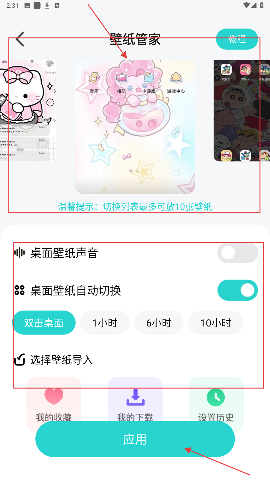 3、点击【自动切换】,可管理已选择的壁纸,设置桌面壁纸声音、自动切换时间等功能,点击【应用】按钮保存设置。