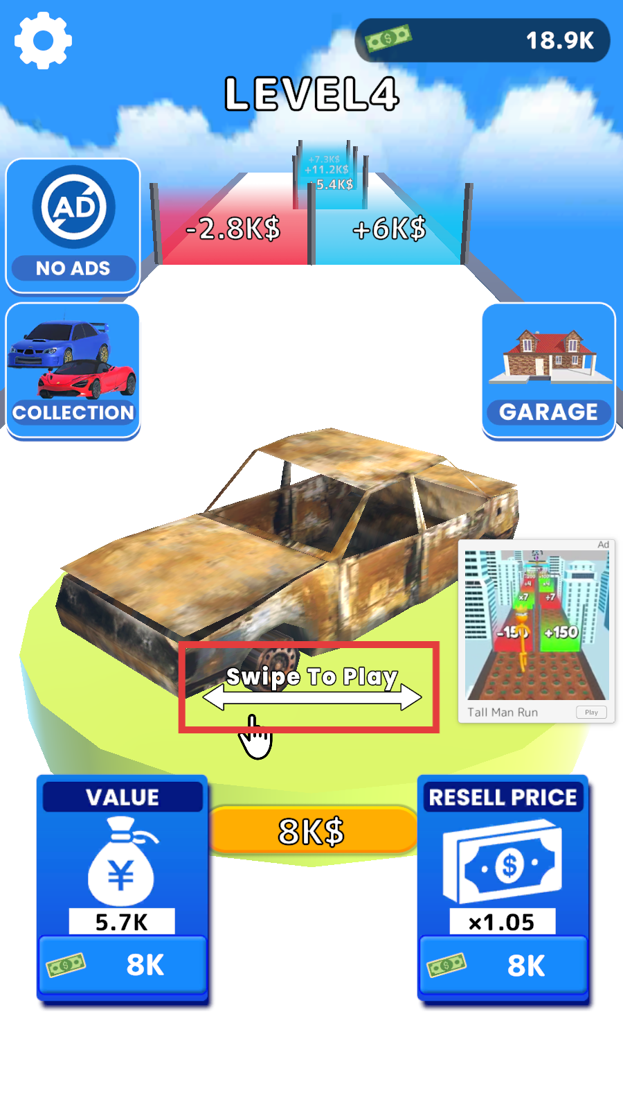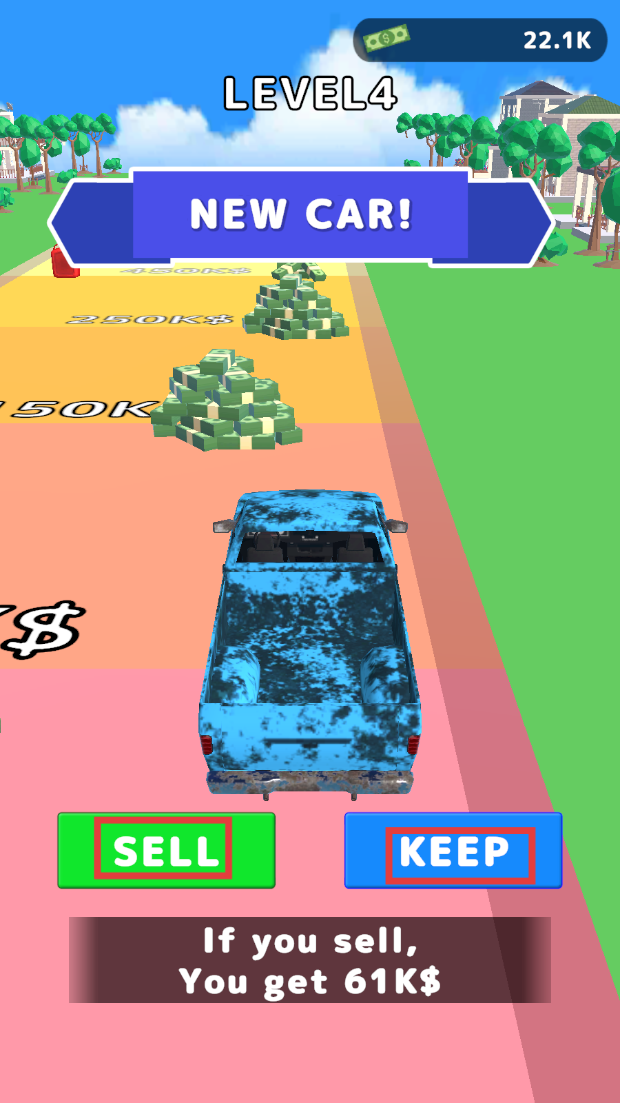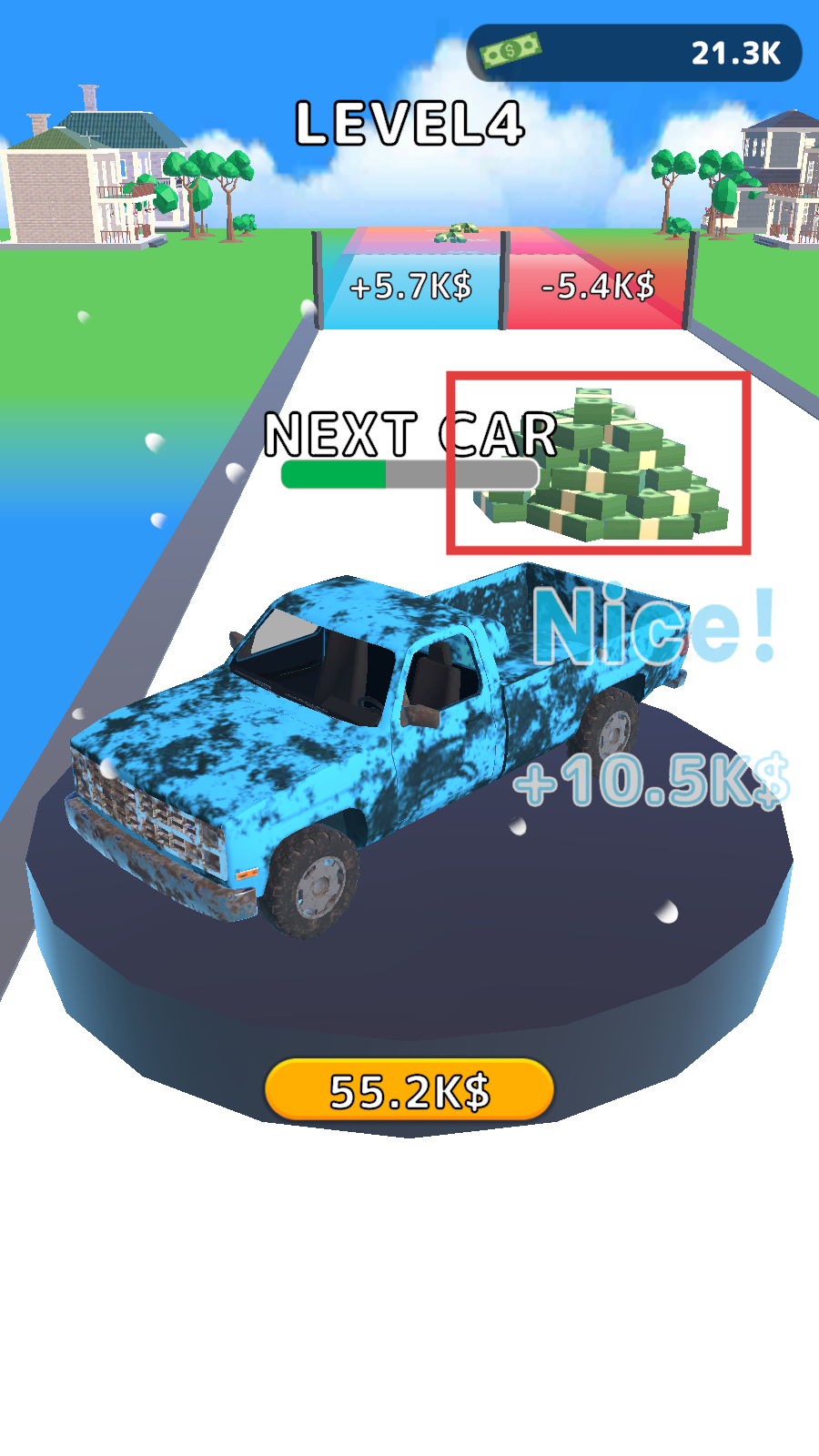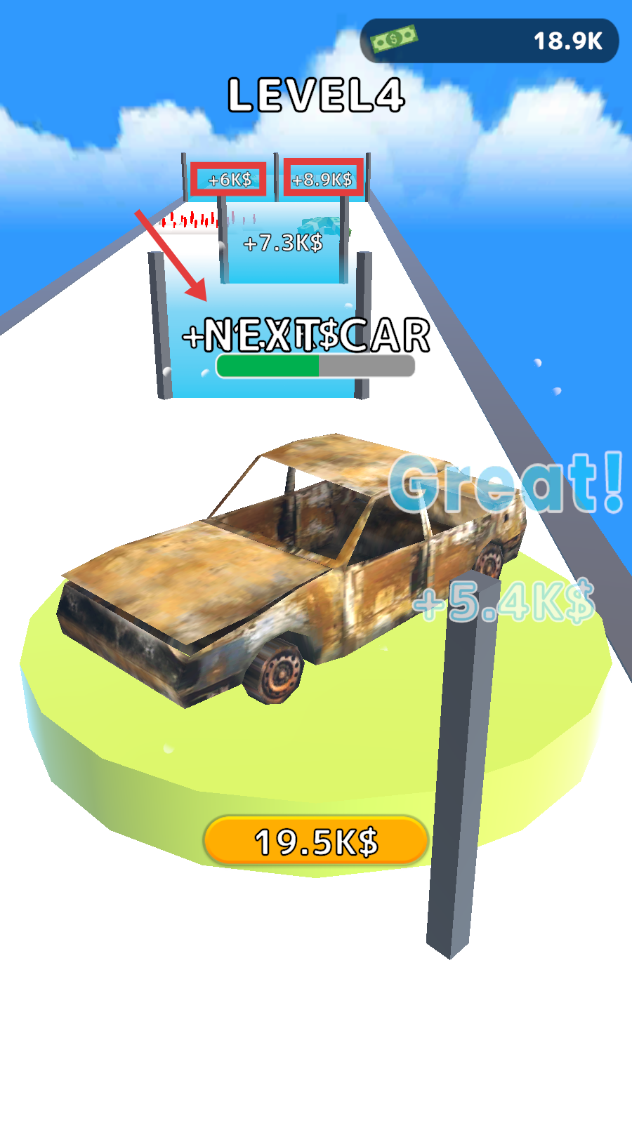 3、获得新汽车后,沿路径行驶,尽量触碰金钱堆,提升车辆价值和收益。