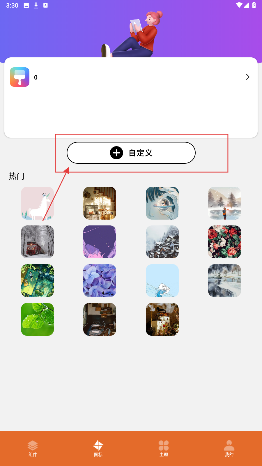 1、在主题界面点【自定义】,开启专属主题制作,自由搭配元素。