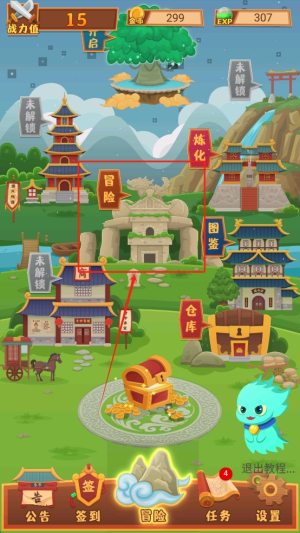 1、首先,查看主界面上的“冒险”、“炼化”、“图鉴”和“仓库”等按钮,了解它们的基本功能。