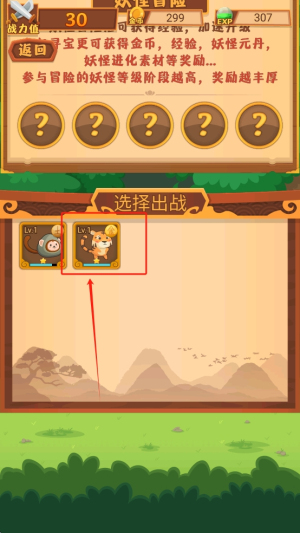 2、接着,选择出战妖怪。在“妖怪冒险”界面中,点击选择出战的妖怪,准备开始战斗。