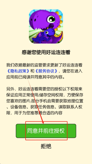 1、首先,点击“同意并前往授权”按钮,以允许应用访问必要的权限,从而开始游戏。