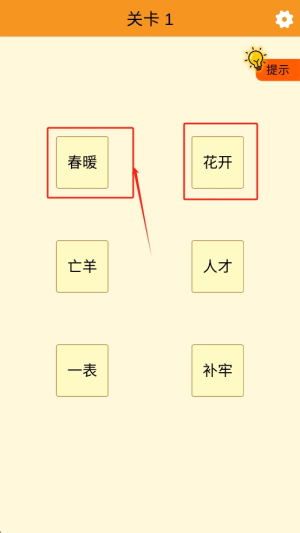 2、接着,选择成语。在关卡界面中,点击两个可以组成成语的方块,例如“春暖花开”。