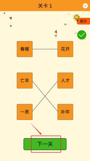4、最后,进入下一关。当所有成语都正确连接后,点击“下一关”按钮,继续游戏。