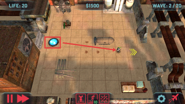 2、场景中的蓝色传送装置会生成敌人,我们需要再敌人行进路上,放置防御塔进行高效拦截。