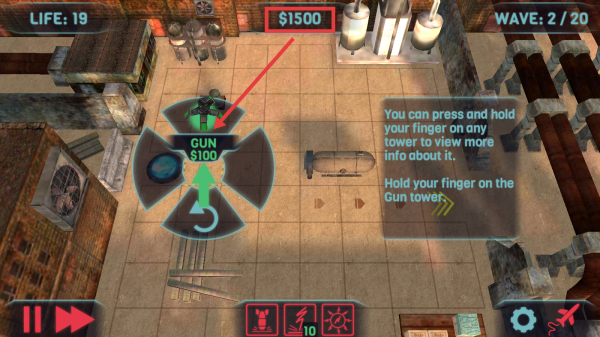 4、利用【$1500】初始资金,花【$100】建【GUN】塔,长按塔查看详情优化布局。