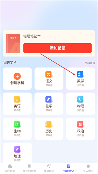 2、在错题笔记页面中,选择对应学科进入错题本。