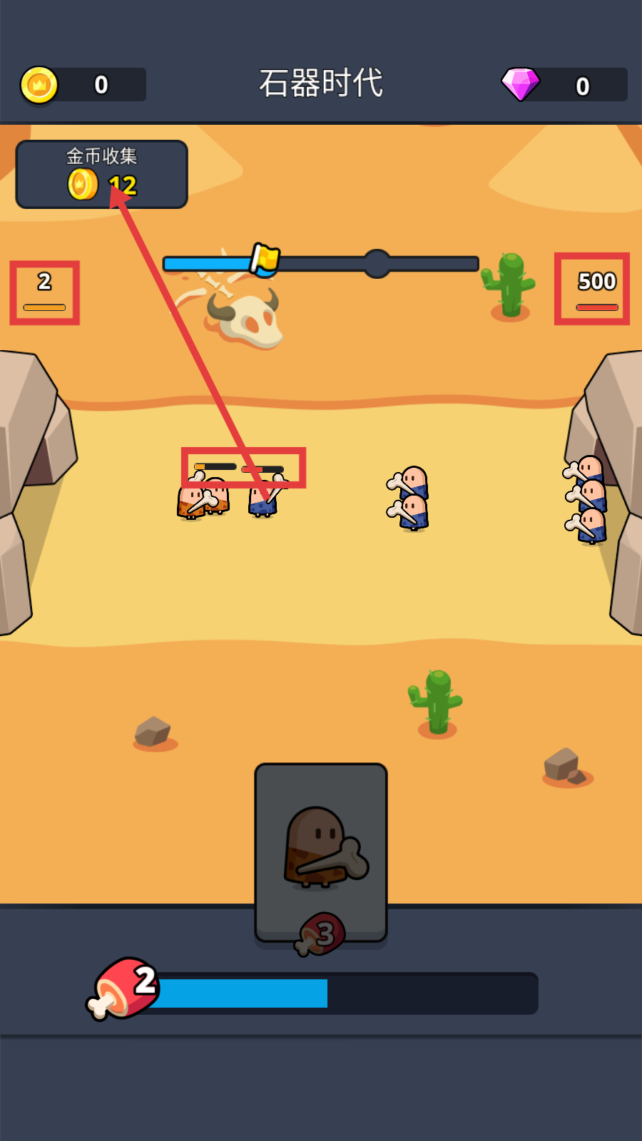 2、注意【金币收集-12】的提示,通过击败敌人等方式收集金币,积累资源,注意双方基地血量,敌我实力悬殊,我们要合理安排每个士兵。