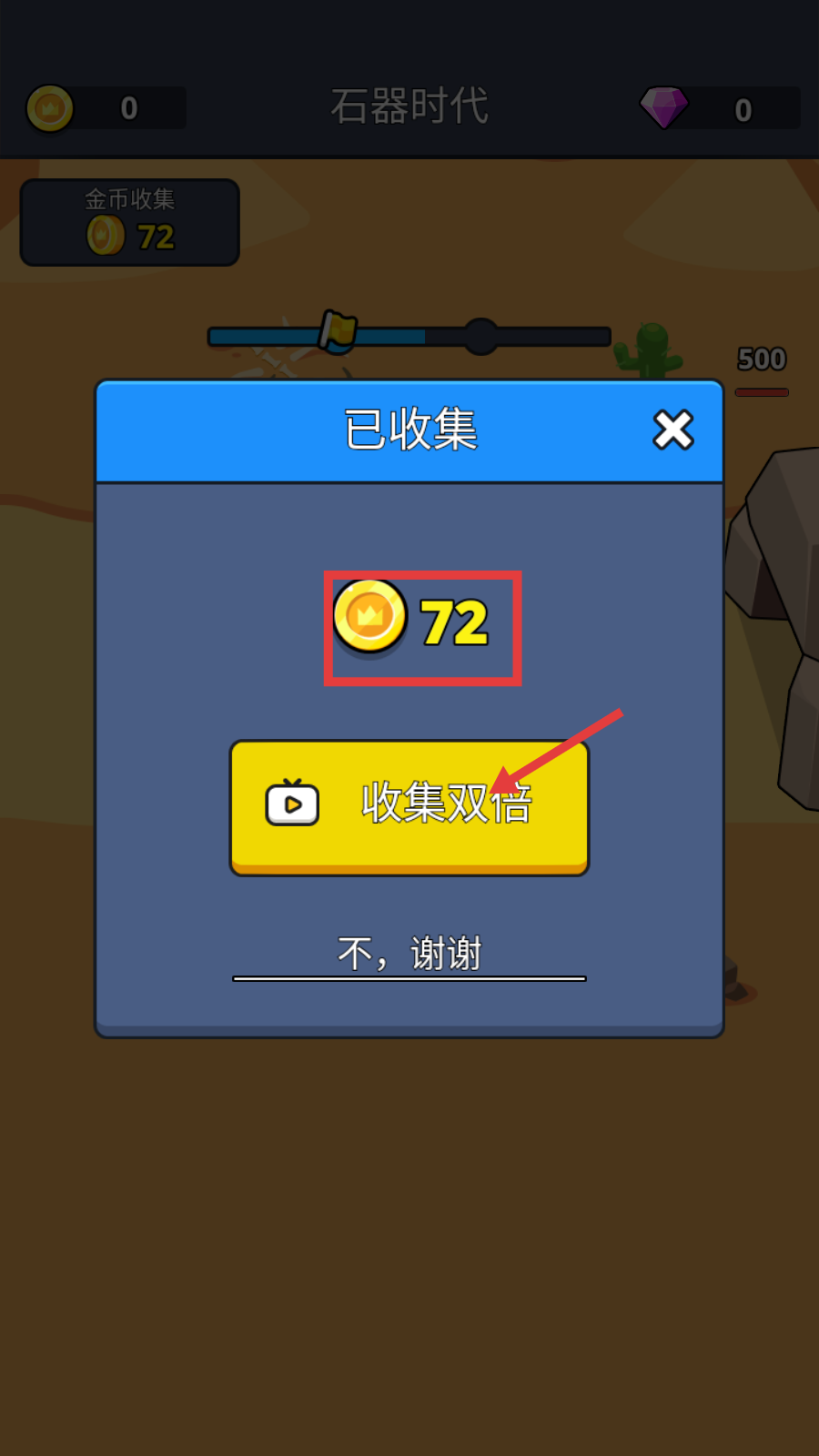 4、当收集到一定数量金币后,会弹出【已收集72枚金币】的提示框,可选择【收集双倍】来获取更多金币。