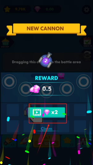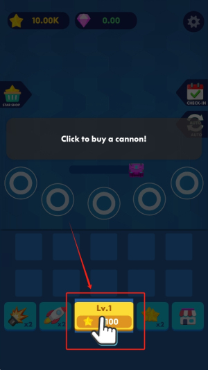 1、首先,购买大炮。点击屏幕下方的黄色按钮,花费100金币购买一个一级大炮。