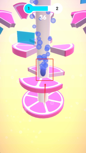 1、操控小球开始从水果塔往下跳,尝试找到间隙跳落,熟悉跳落节奏,再旋转水果塔调整位置,完成首个关卡,开启闯关,上手简单。