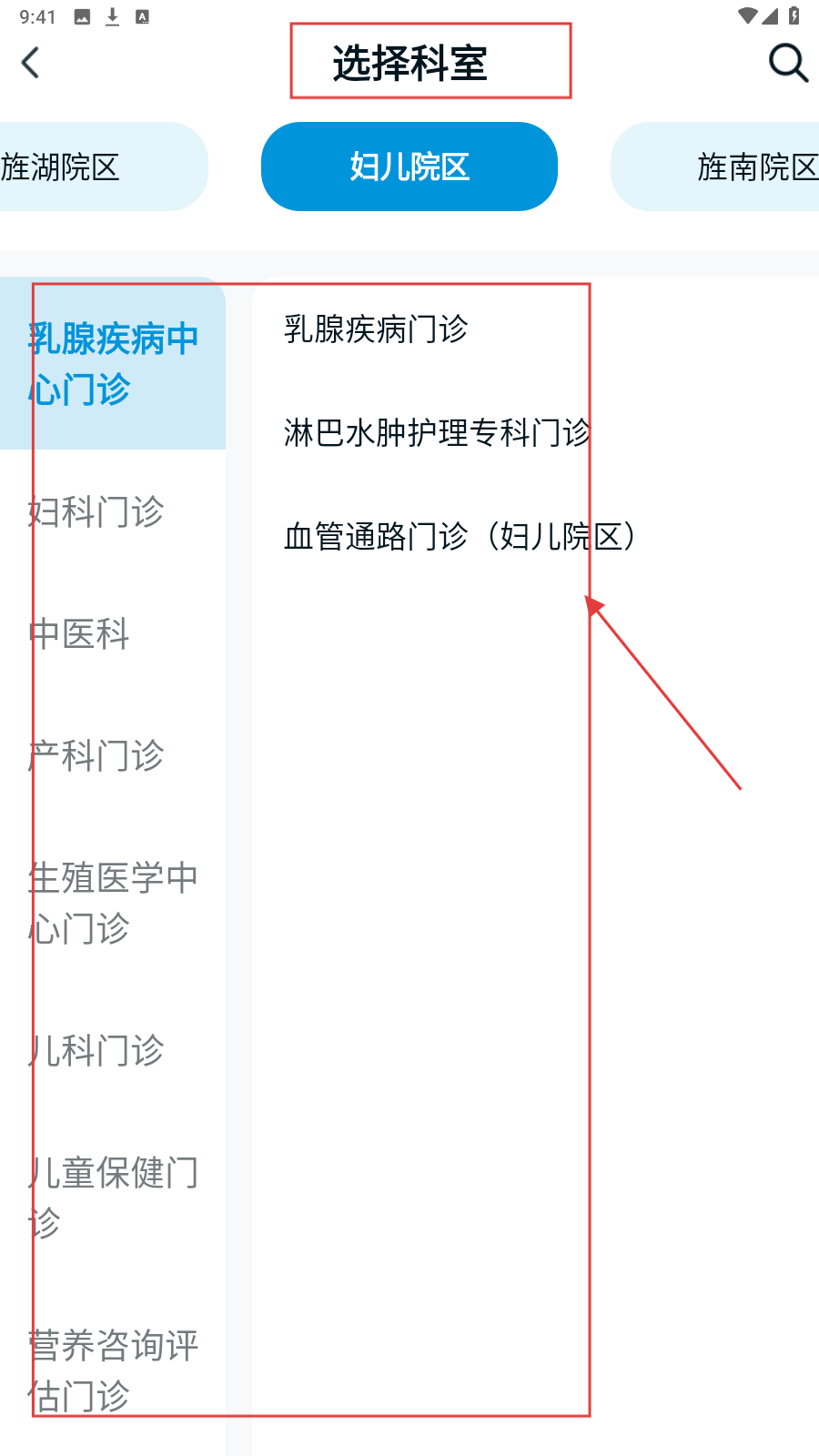 2、进入【选择科室】页面,选择需要挂号的科室并点击。