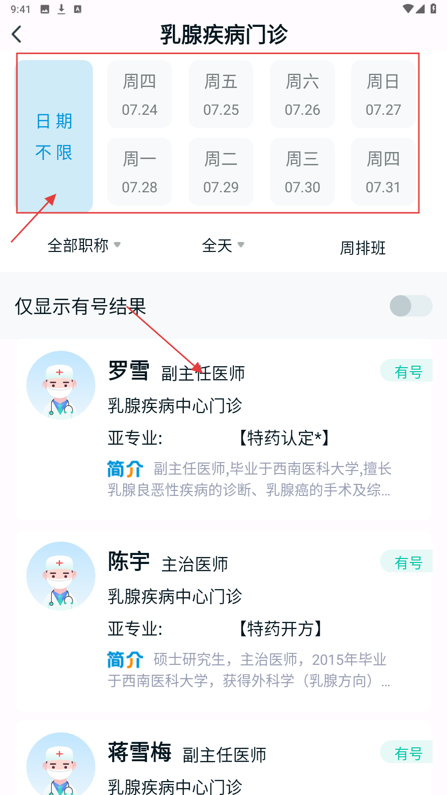 3、进入门诊页面,在上方选择预约的日期,在下方点击要挂号的医生。