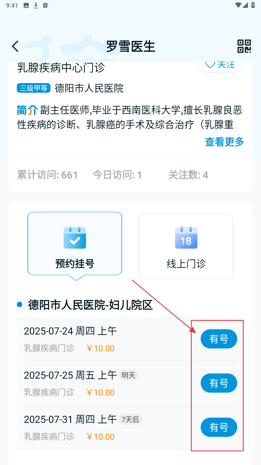 4、进入医生详情页,在【预约挂号】下方选择要挂号的具体时间,点击后方【有号】按钮即可。