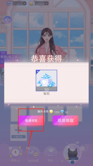 3、领取奖励。完成购买后,点击“普通领取”按钮,获得50钻石奖励。