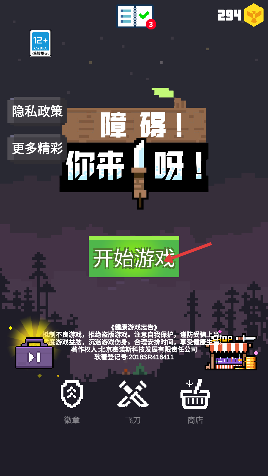 1、点击【开始游戏】按钮即可进入游戏,开启你的飞刀挑战之旅。
