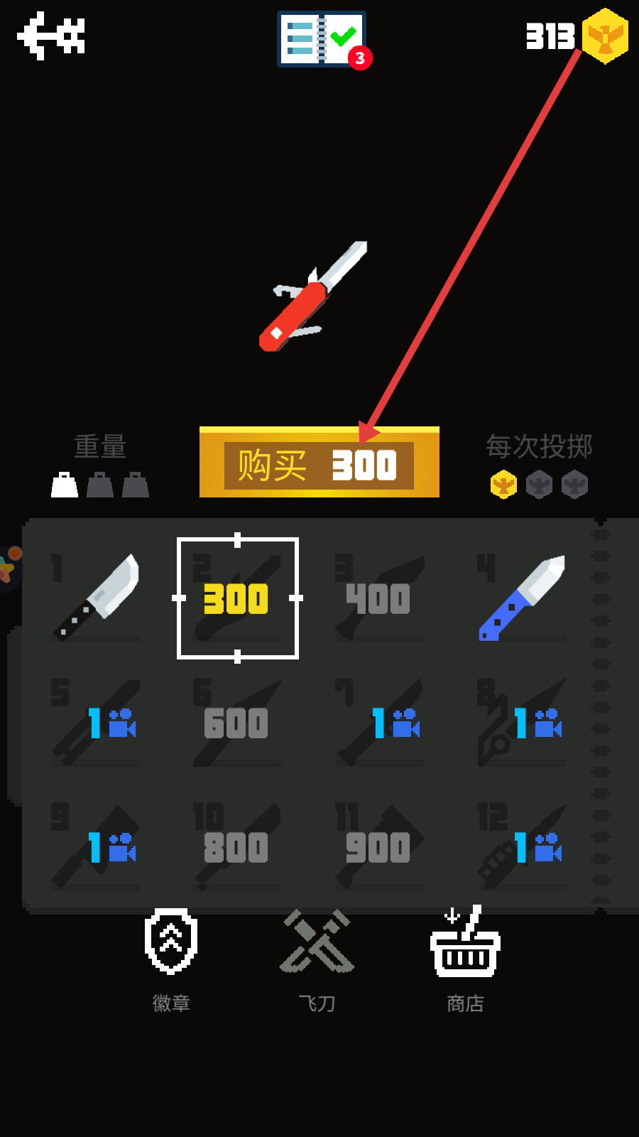4、在商店界面,当拥有足够的游戏货币时,可点击【购买-300】按钮购买新的飞刀,提升游戏体验。