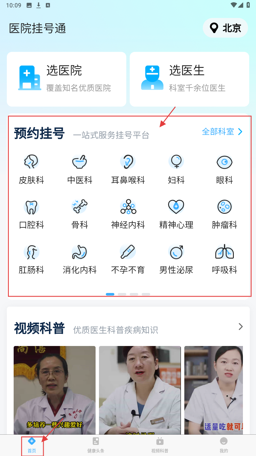 1、打开应用,在首页中的【预约挂号】栏下点击要挂号的科室。