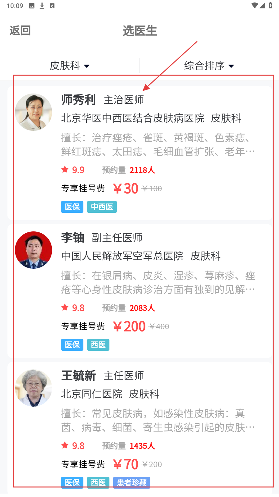 2、进入【选医生】页面,选择挂号的医生并点击。