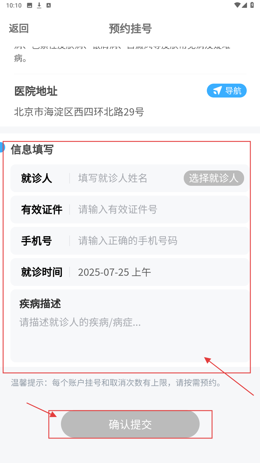 4、进入【预约挂号】页面,按照自身填写信息,填写完成点击【确认提交】即可预约成功。