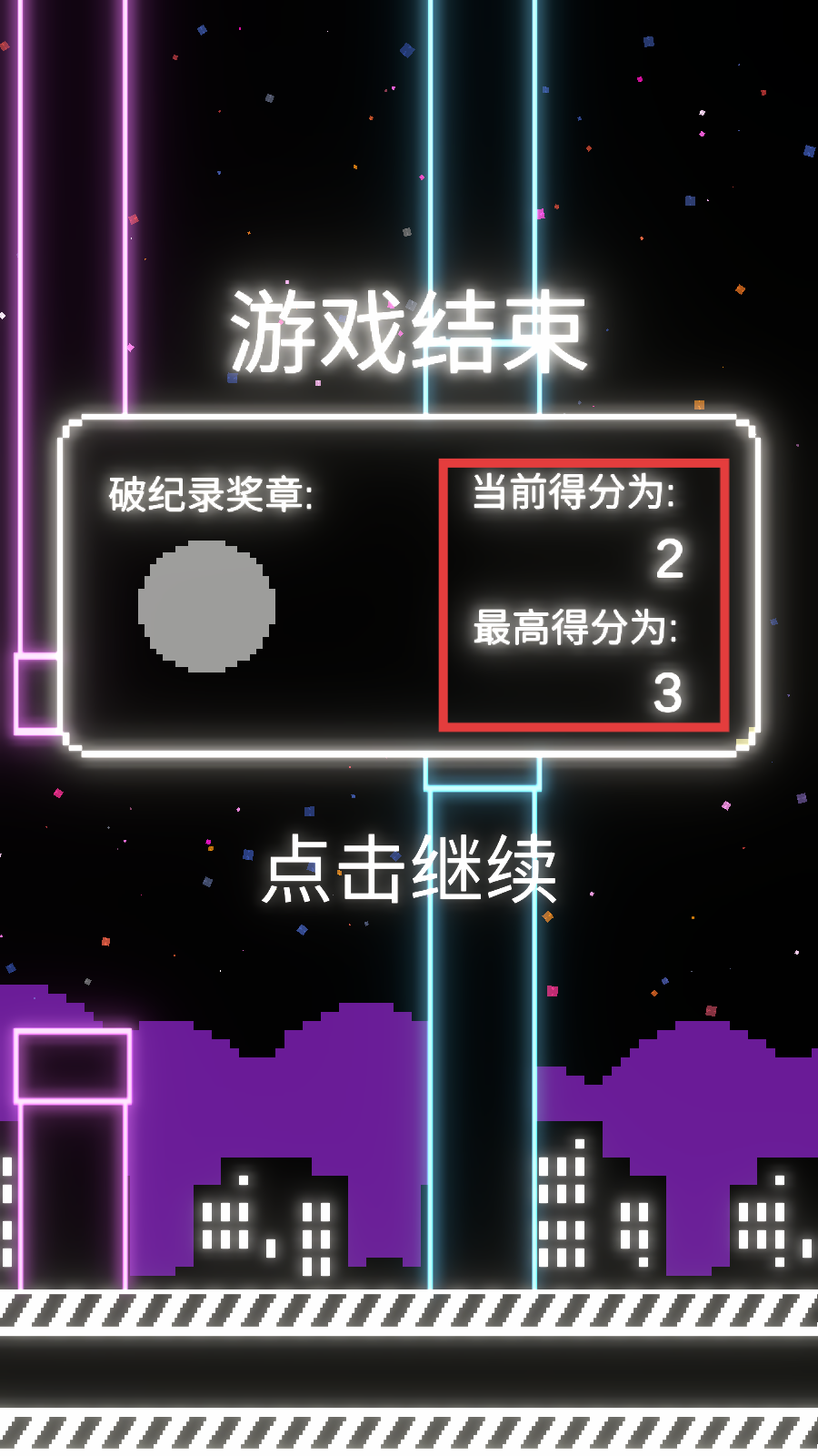 4、游戏结束后,会显示当前得分和最高得分,点击继续可以重新开始游戏,挑战更高分数。