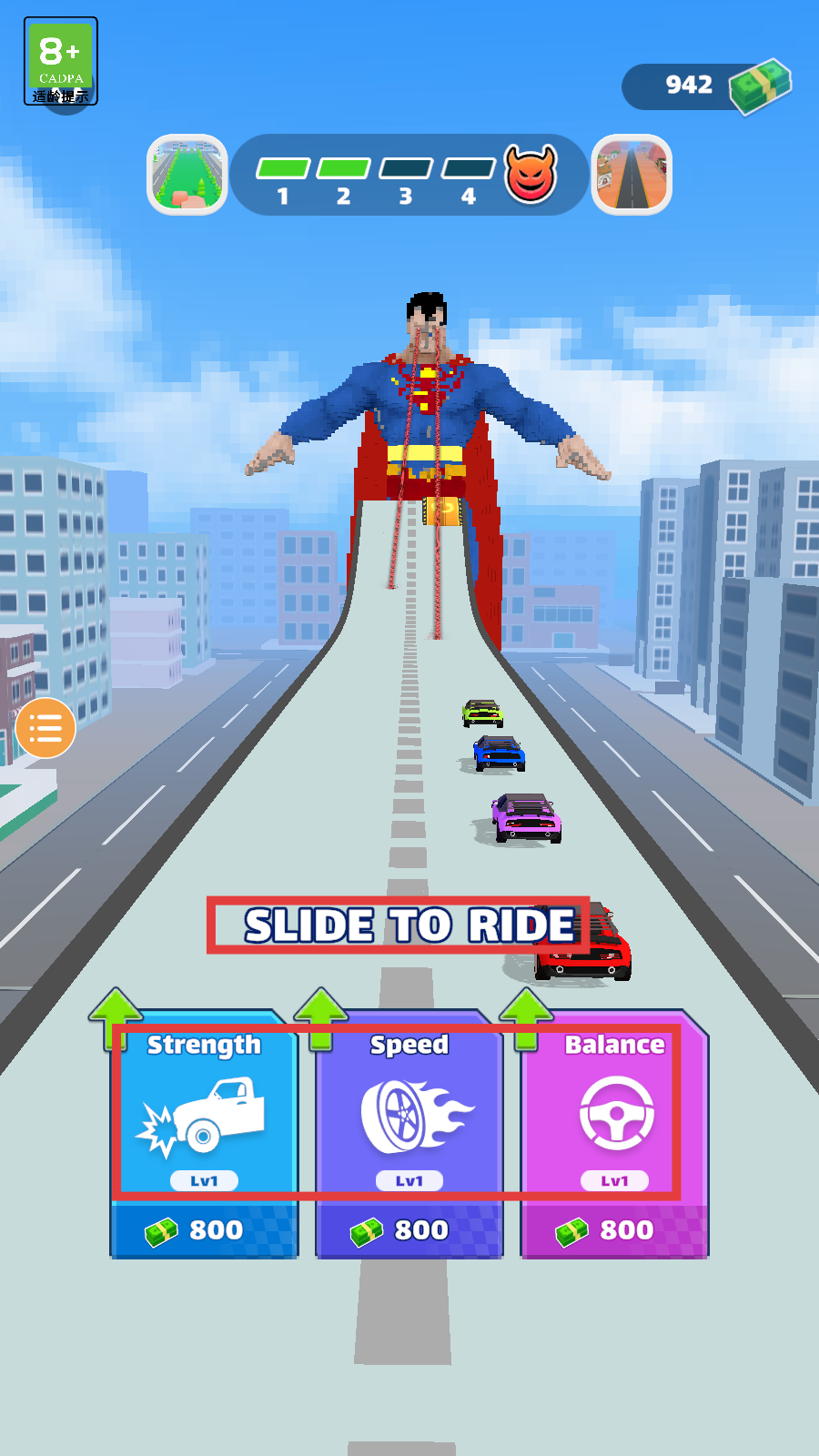 1、点击【SLIDE-TO-RIDE】开始游戏,优先花费800金币提升【Strength】-【Lv1】,增强赛车撞击力。