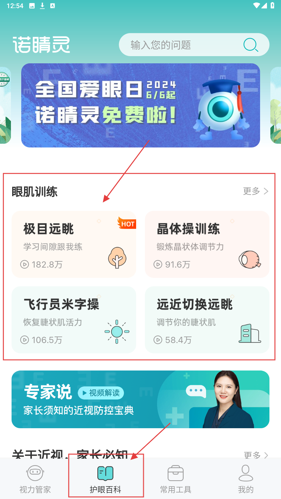 1、打开【诺睛灵】应用,进入首页后点【护眼百科】,选眼肌训练项目开始护眼。