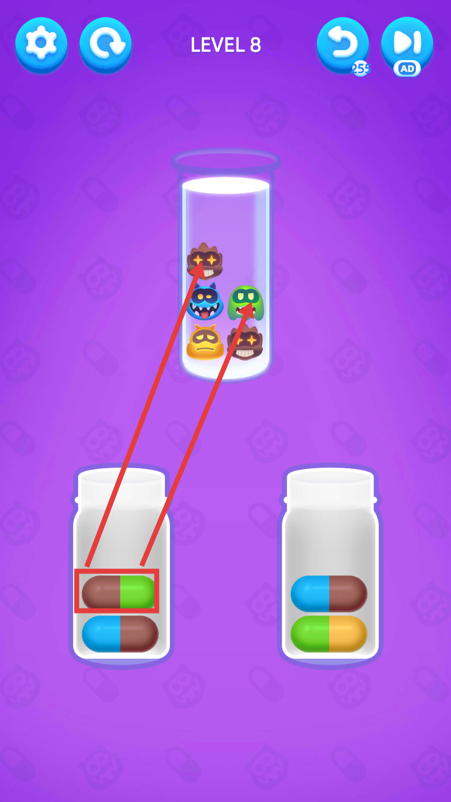 1、进入关卡后,先观察试管中细菌的颜色,选择对应颜色的药丸进行消除。