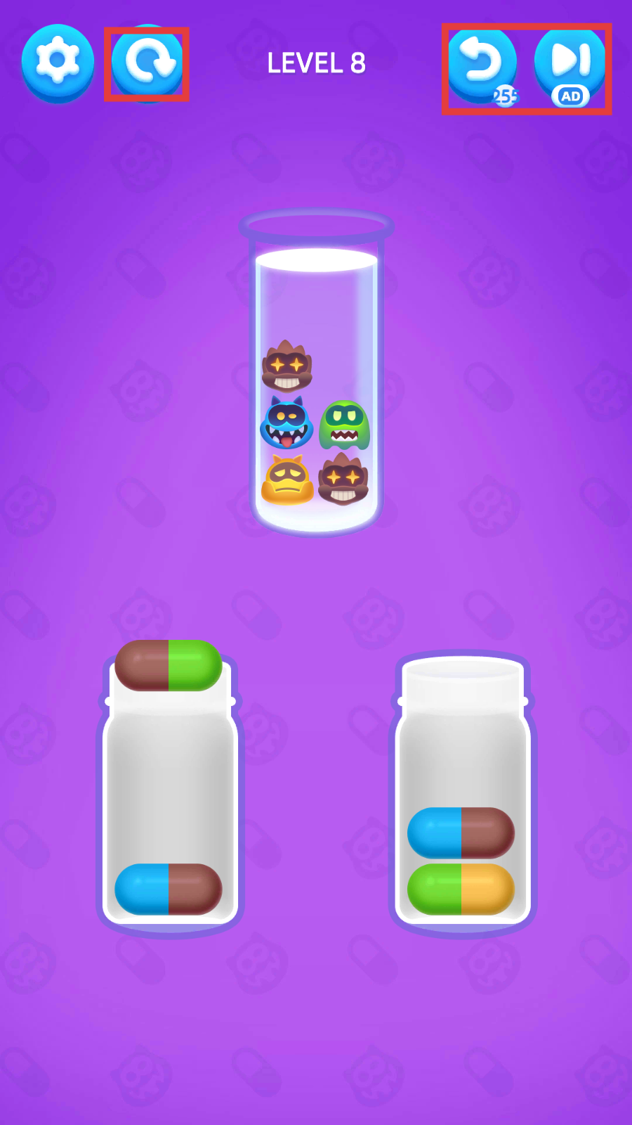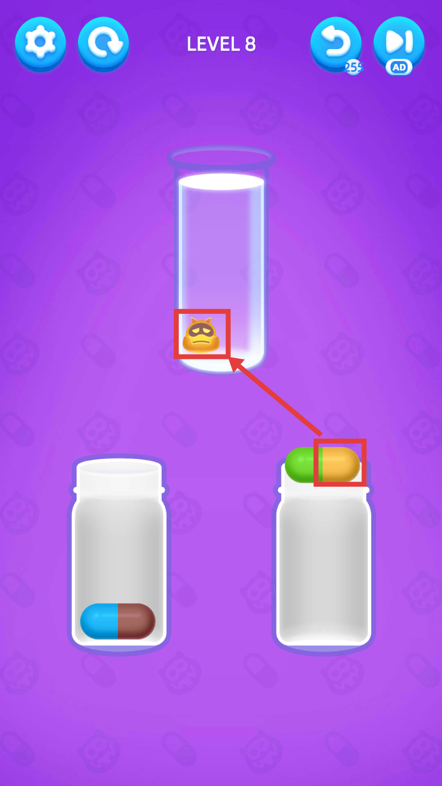 1、解压操作体验:点击屏幕选择位置后药丸自动下落进行匹配。成功消除时触发清脆音效与动态反馈。简单交互带来轻松愉悦的娱乐时光。