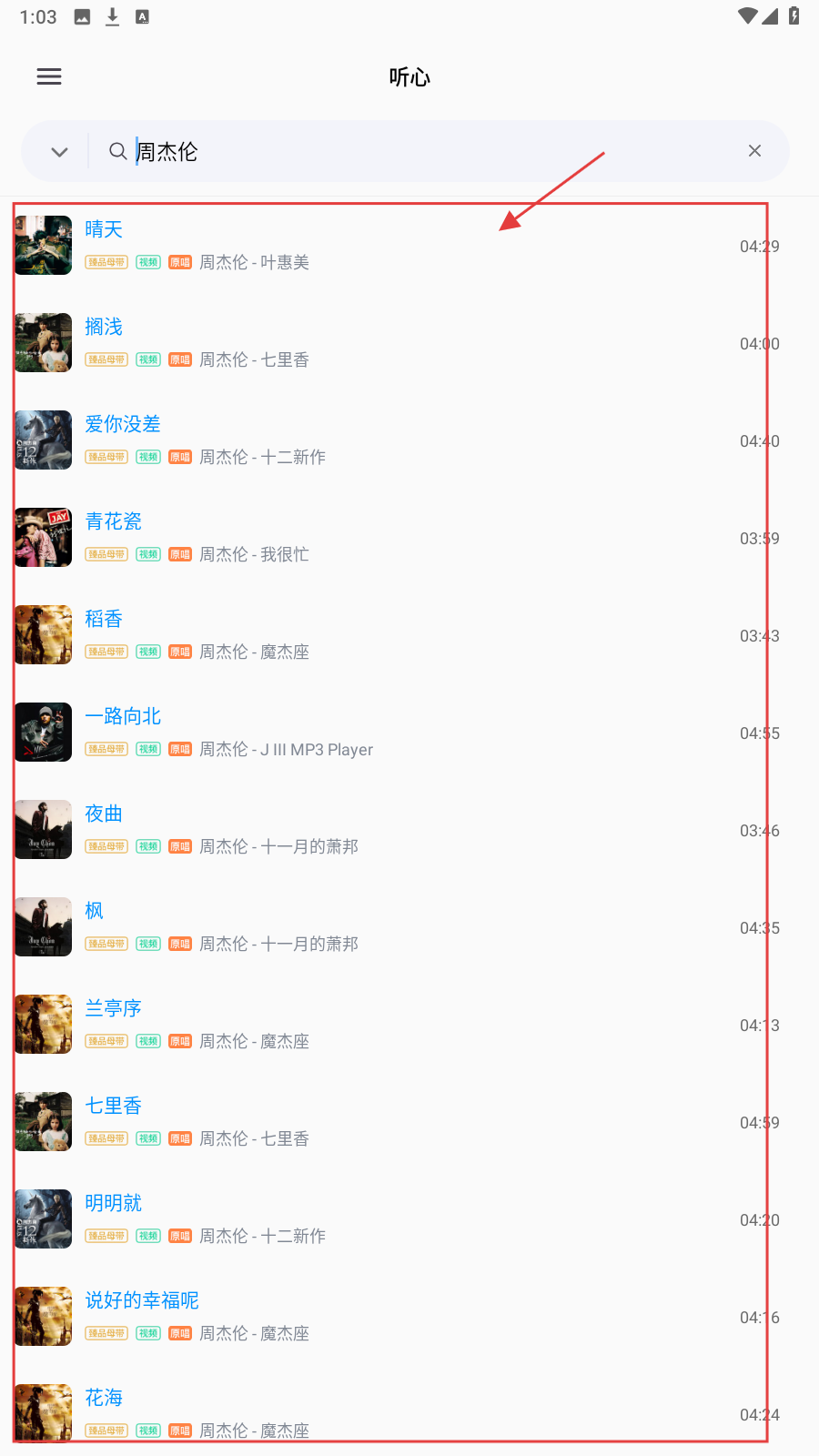 2、搜索结果页,浏览歌曲列表,点击目标歌曲(如周杰伦-晴天)。