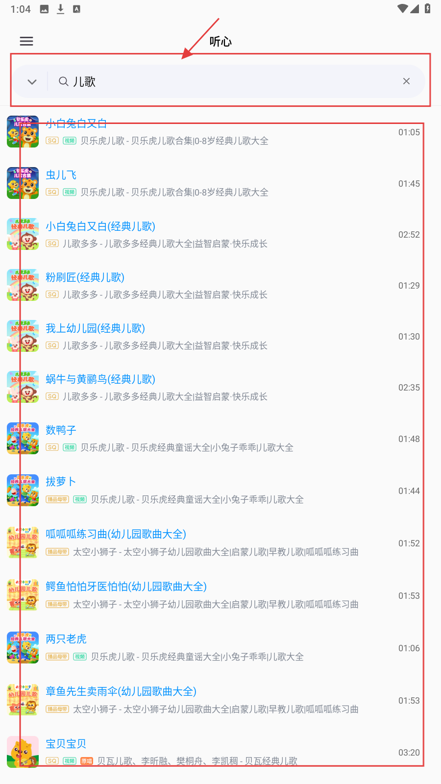 4、若想听儿歌,搜索框输【儿歌】,从结果选喜欢的曲目播放。