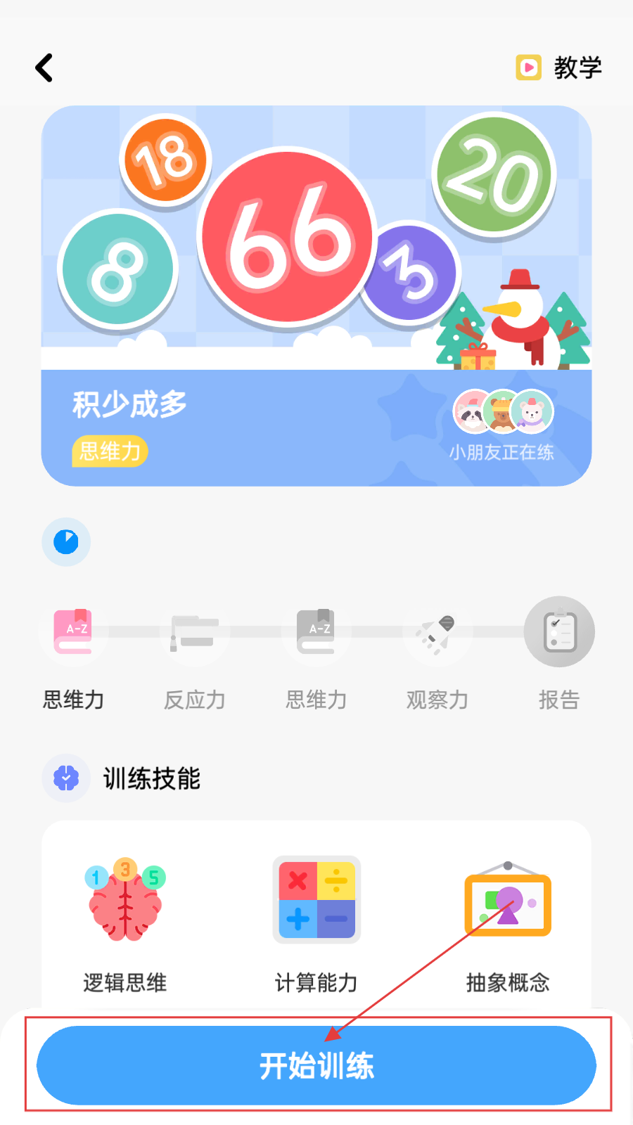 1、进入【积少成多】思维力训练页面,点击【开始训练】开启挑战,准备锻炼思维。