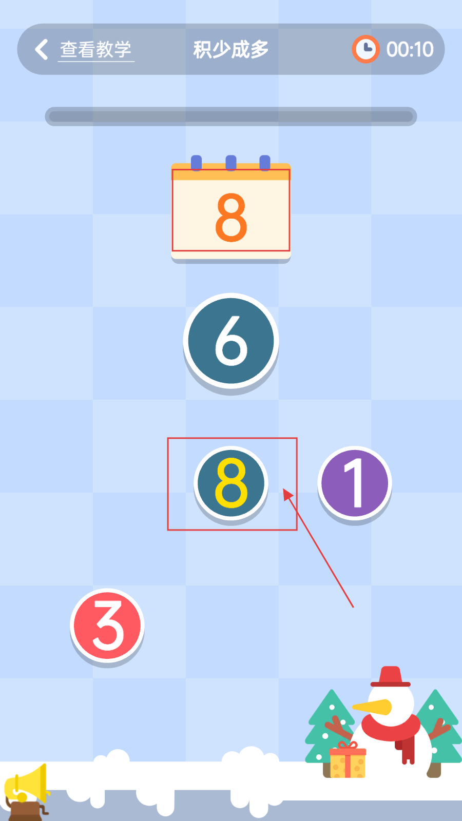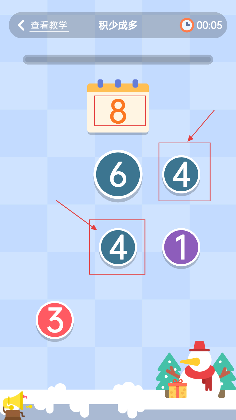 2、在训练界面,根据数字目标,快速找出相加能达成日历上的数字【8】的数字组合。