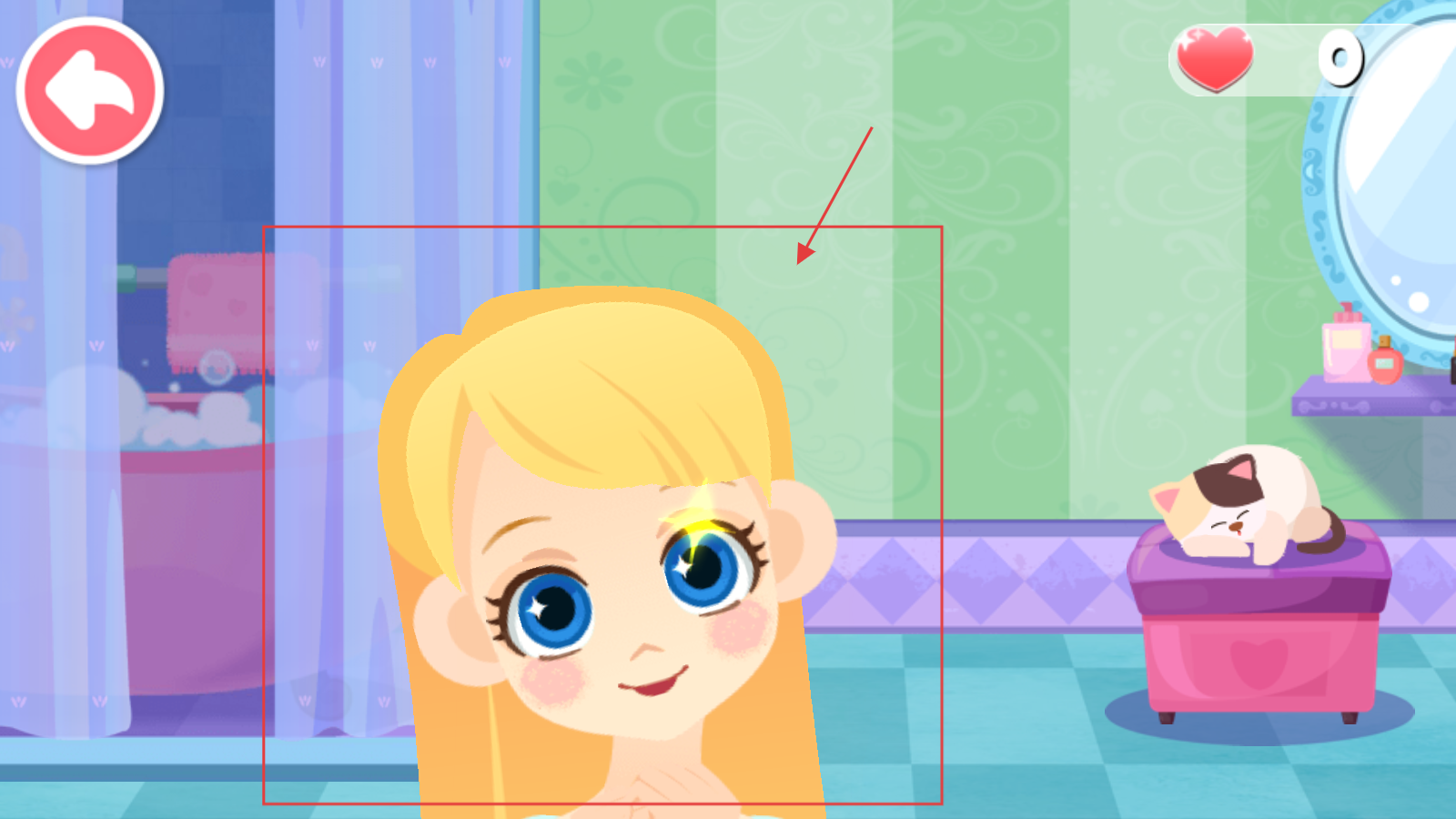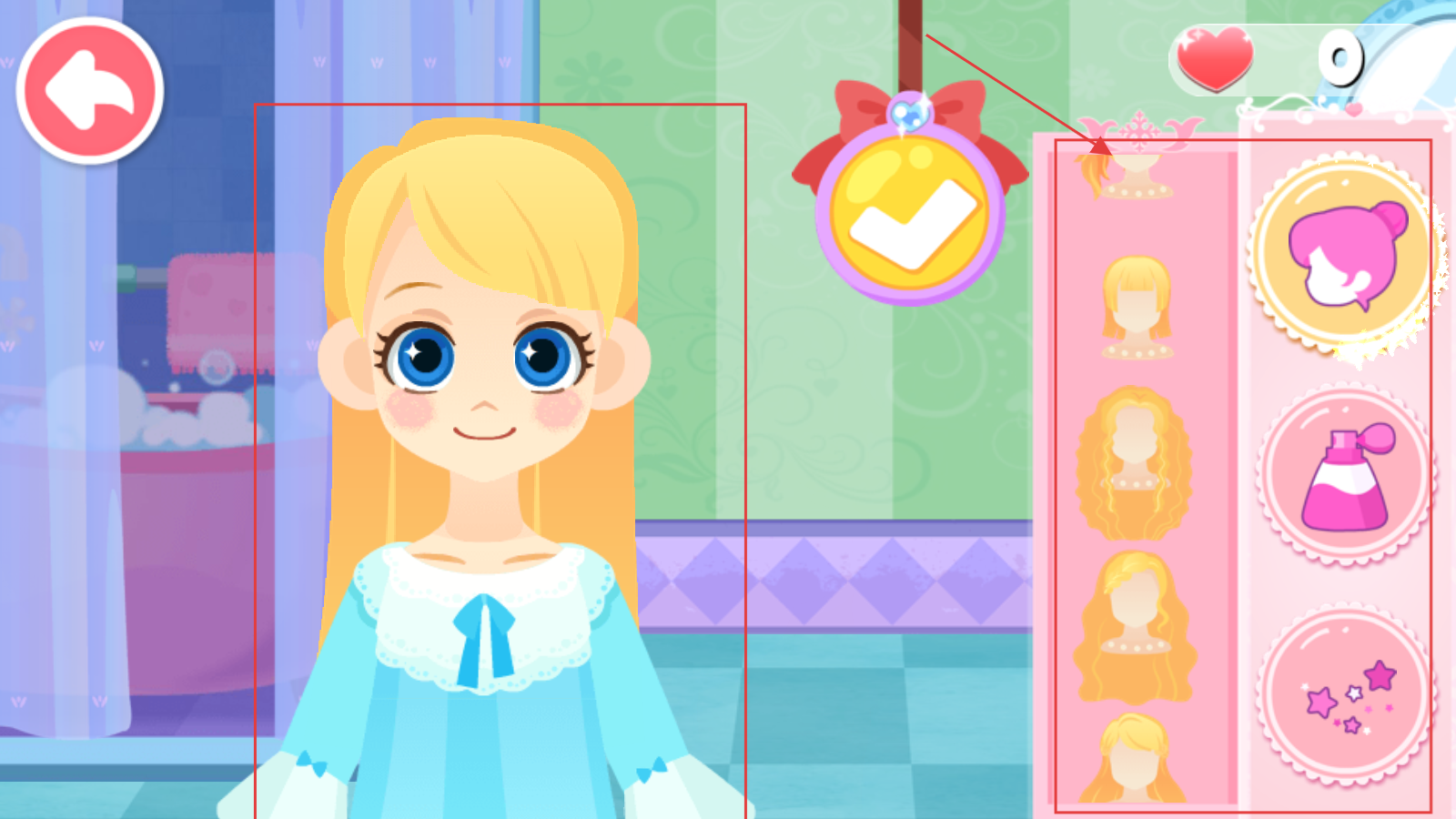2、进入关卡页面后,用右侧粉色剪刀,清理女孩头发上的树叶、杂物,还原基础发质。