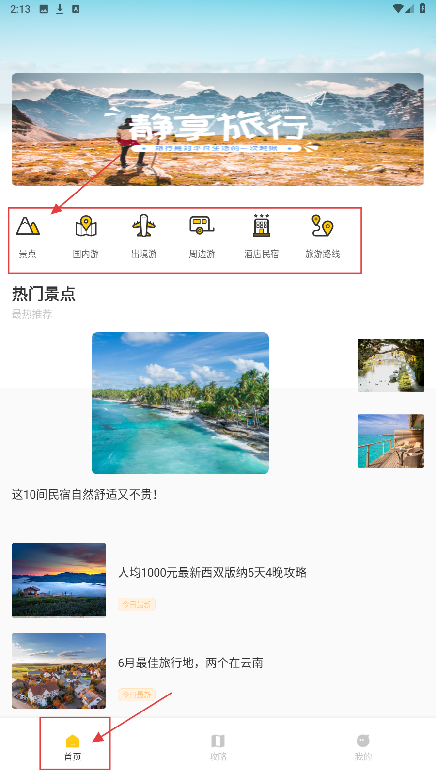 1、进入APP【首页】,点击【景点】入口,可开启景点探索之旅,快速查找想去的地方。