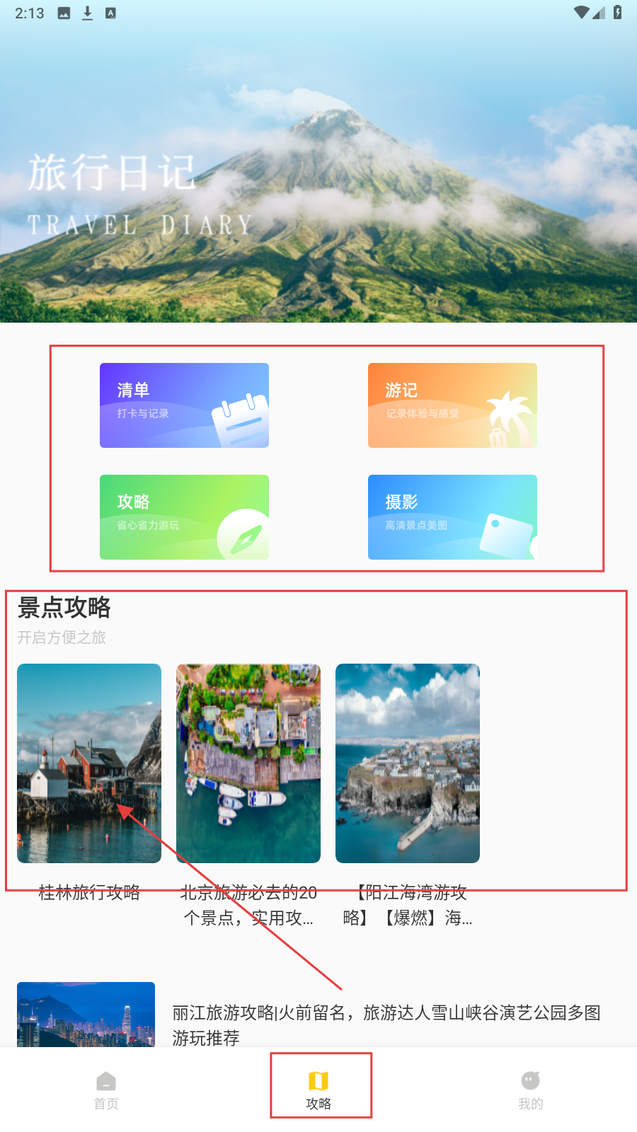 3、切换到【攻略】页,利用【清单】【攻略】等功能,提前为旅行做打卡、游玩规划,省心省力。