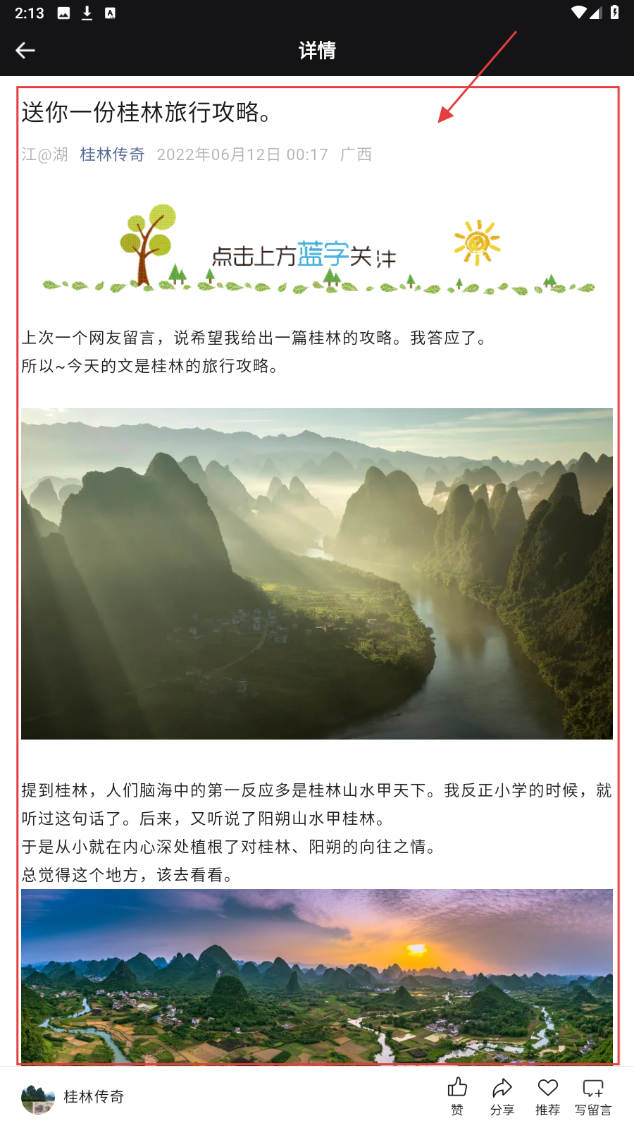 4、查看具体攻略详情,像【桂林旅行攻略】,了解景点特色与游玩感悟,为旅行做参考准备。