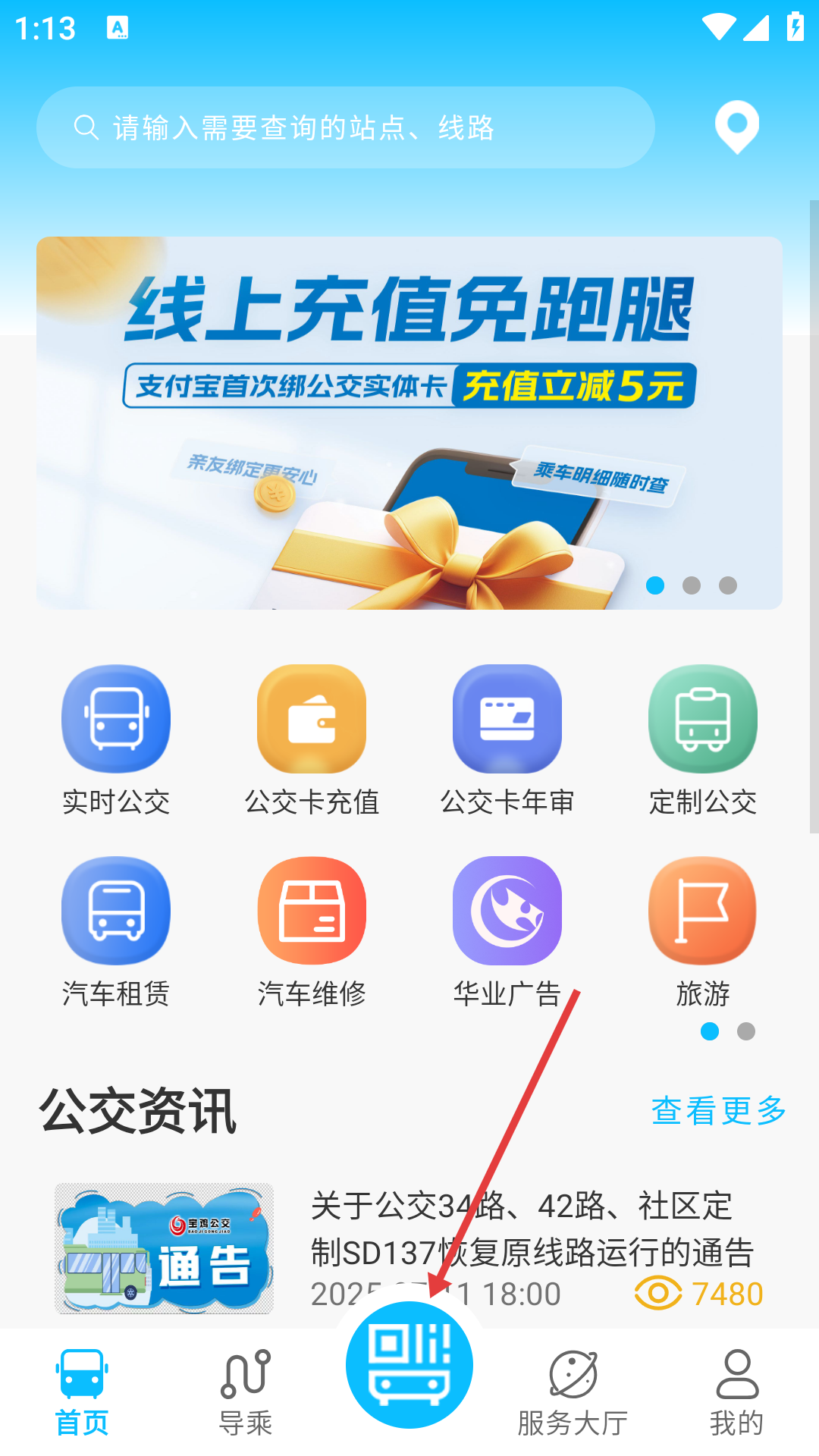 1、打开APP首页,点击底部乘车码图标,进入乘车码界面。