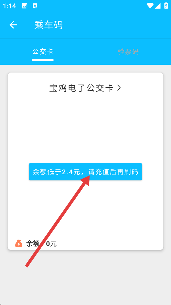 2、在乘车码页,看到余额不足提示,点击提示进入充值流程。