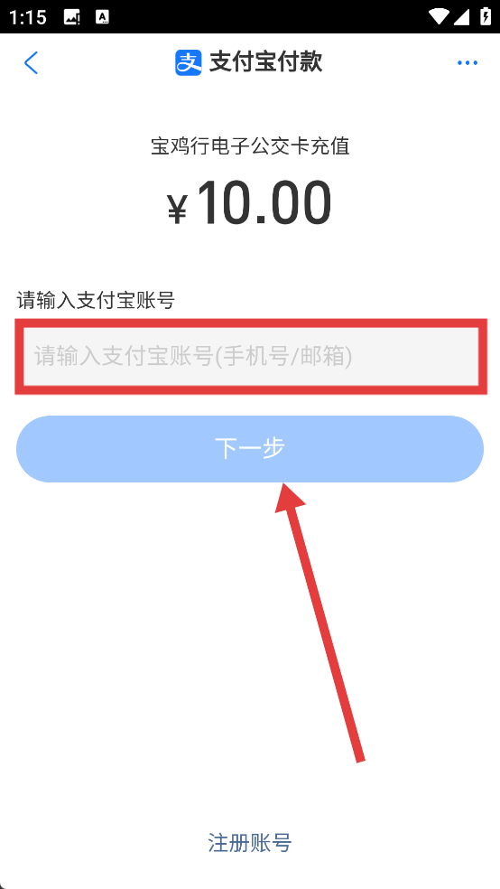 4、支付宝付款页,填入账号,点击【下一步】完成公交卡充值。