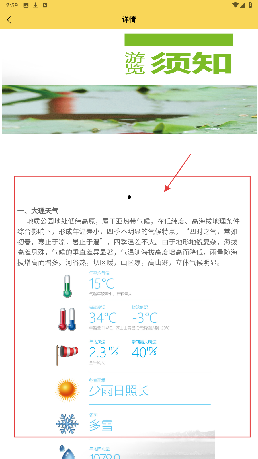 2、在详情页查看【大理天气】,了解气候特点,备好合适衣物,应对旅行天气。