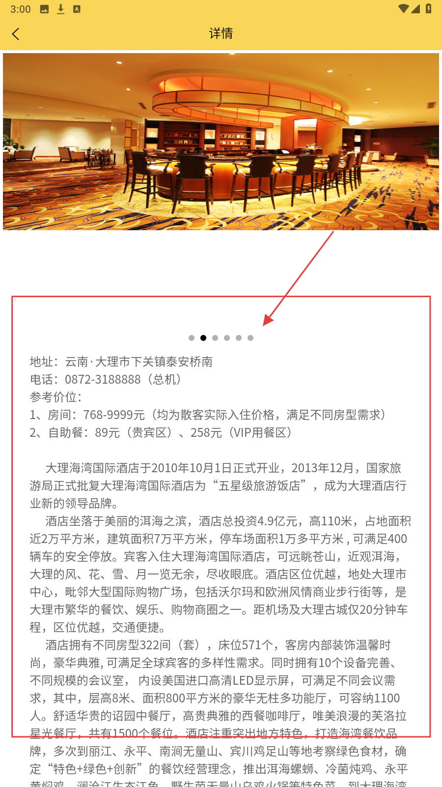 4、查看酒店详情,记好【大理海湾国际酒店】地址电话,按需预订住宿。